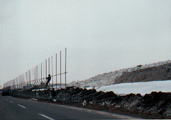 風除ネットや風除板の設置だけで知らん顔 雪堆積場からのゴミによる被害は各地で起きているせいか、とりあえずは設置したが、それ以上に深刻な春期の雪解け水被害や低温被害への対策は一切行おうという素振りもない。 また、左写真の風除板は、雪堆積場のあまりにもずさんな管理状況を見せないために設置されているとも見方も・・。 |
