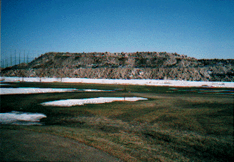 | 深刻な農作物の低温被害 芝作農地に迫る雪堆積場。雪堆積場周辺は気温が低くなるために、芝の育成に大きな障害を与えている。 |