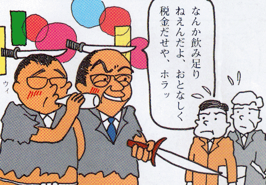 ♪カンカンカン みんなカンカン怒ってる 関係ない 国民なんか関係ない ウラ金つくって飲み明かそう 国民いじめて飲み明かそう カンカンカン みんなカンカン怒ってる 官僚特権怒ってる 税金ドロボー怒ってる 無節操官僚 国民をなめるな! カンカンカン みんなカンカン怒ってる 関係ない 国民なんか関係ない ウラ金返せばいいんだろう 国民いじめて接待だ カンカンカン みんなカンカン怒ってる カラカラ裏金怒ってる 税金ドロボー怒ってる 無節操官僚 国民をなめるな! ※ウラ金 カラ出張 税金サギ エリート官僚に無節操ウイルス発生 税金をサギして 私腹をこやし 弱い者をいじめて 最後には 返せばいいんだ スリもサギもドロボーも 見つかったら返せばいいのか! カンカンカン みんなカンカン怒ってる 関係ない 国民なんか関係ない 何人死んでも関係ない 税金使って飲み明かそう カンカンカン みんなカンカン怒ってる 無責任行政怒ってる 税金ドロボー怒ってる 無節操官僚 国民をなめるな!♪ |